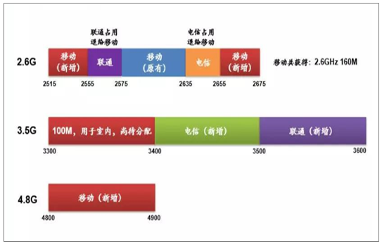 在具体频谱分配方案方面,根据工信部的规划,预计中国电信和中国联通方面将分别拿到3.4GHz~3.5GHz的100MHz带宽和3.5~3.6GHz的100MHz带宽。对于中国移动而言,中国移动将会被新分配到2.6GHz频点附近100MHz带宽以及4.8GHz频点附近频段。